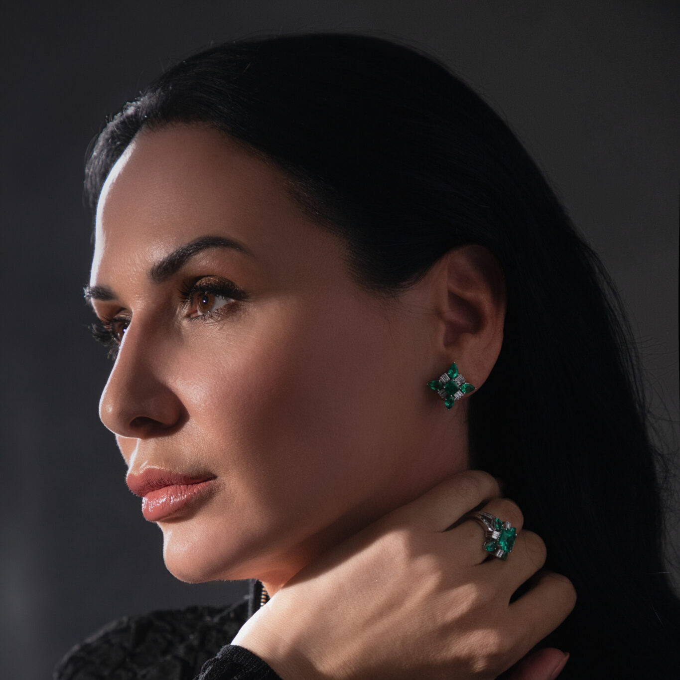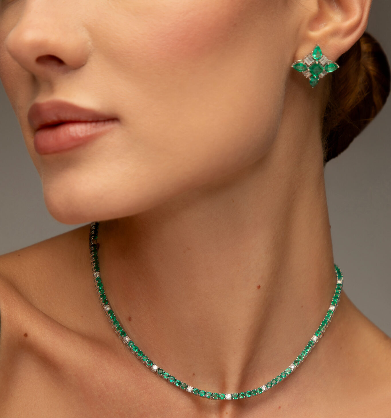 Handcrafted in 18k White Gold, Centered with 2 Square Cut Emeralds 2.08ct., and Accented by 8 Pear Cut Emeralds 3.44ct., 24 Baguette Cut Diamonds 1ct. F-Vs.
