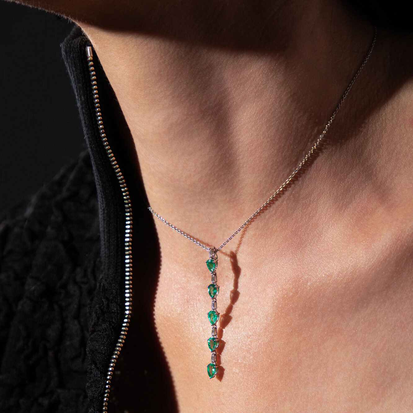 Handcrafted in 18k White Gold, Centered with 5 Pear Cut Emeralds 2.15ct. from Zambia, and Accented by 5 Baguette Cut Diamonds 0.45ct. F-Vs. With DEMICHELI Authentic Logo Clasp.