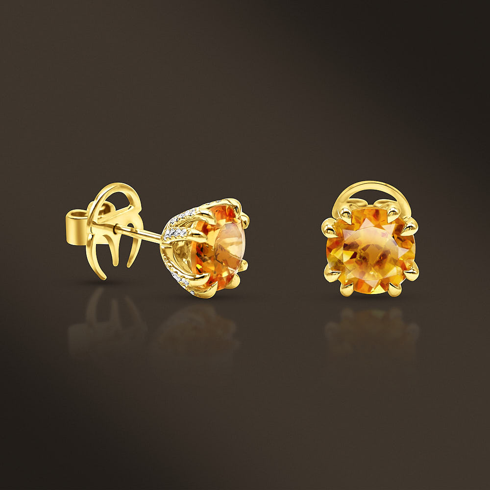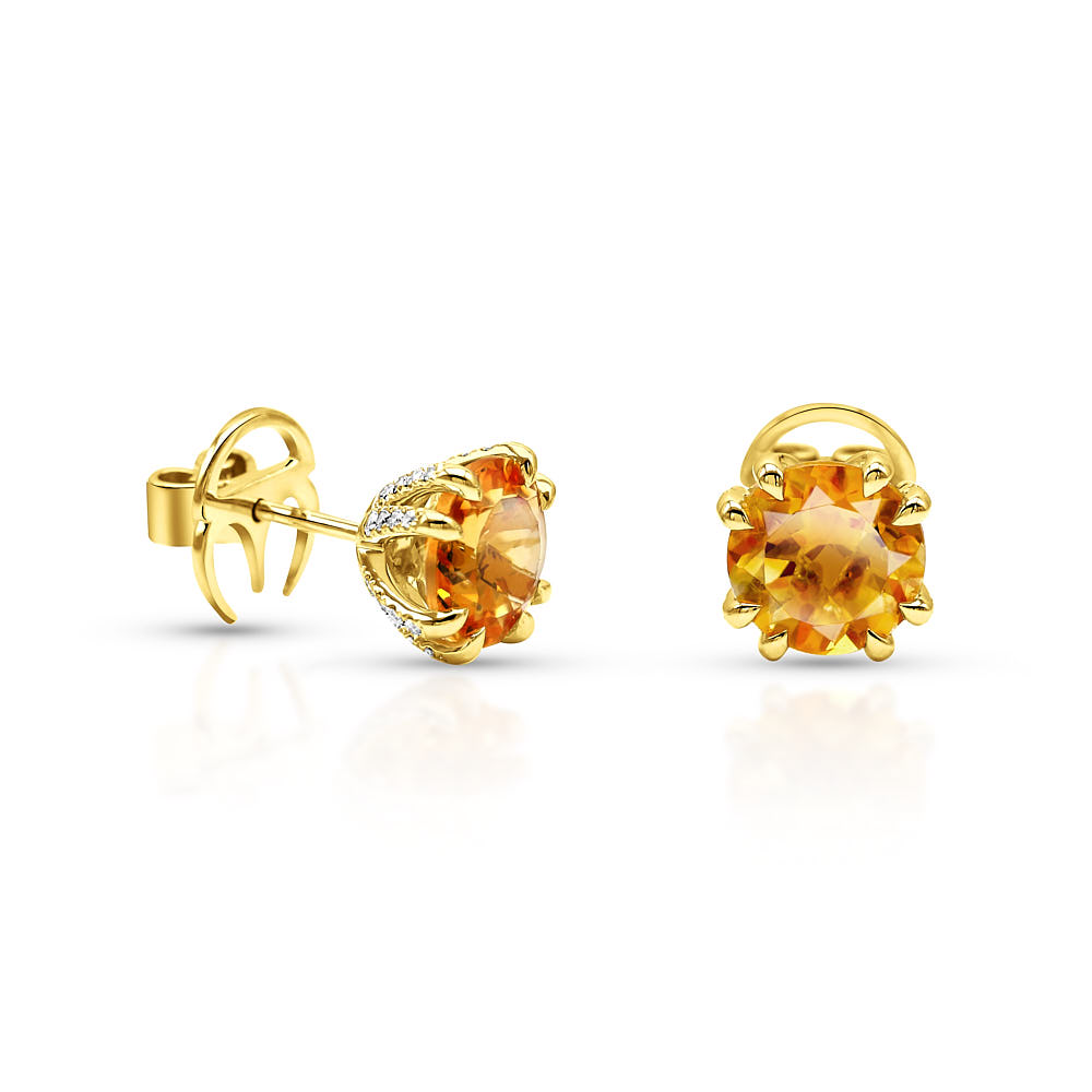 Description: Handcrafted in 18k Yellow Gold, Centered with Citrine Round 2 pcs. 3.79ct., and Accented by 64 Brilliant Cut Diamonds 0.29ct. Item weight: 4.10g. Gold weight: 3.29g.
