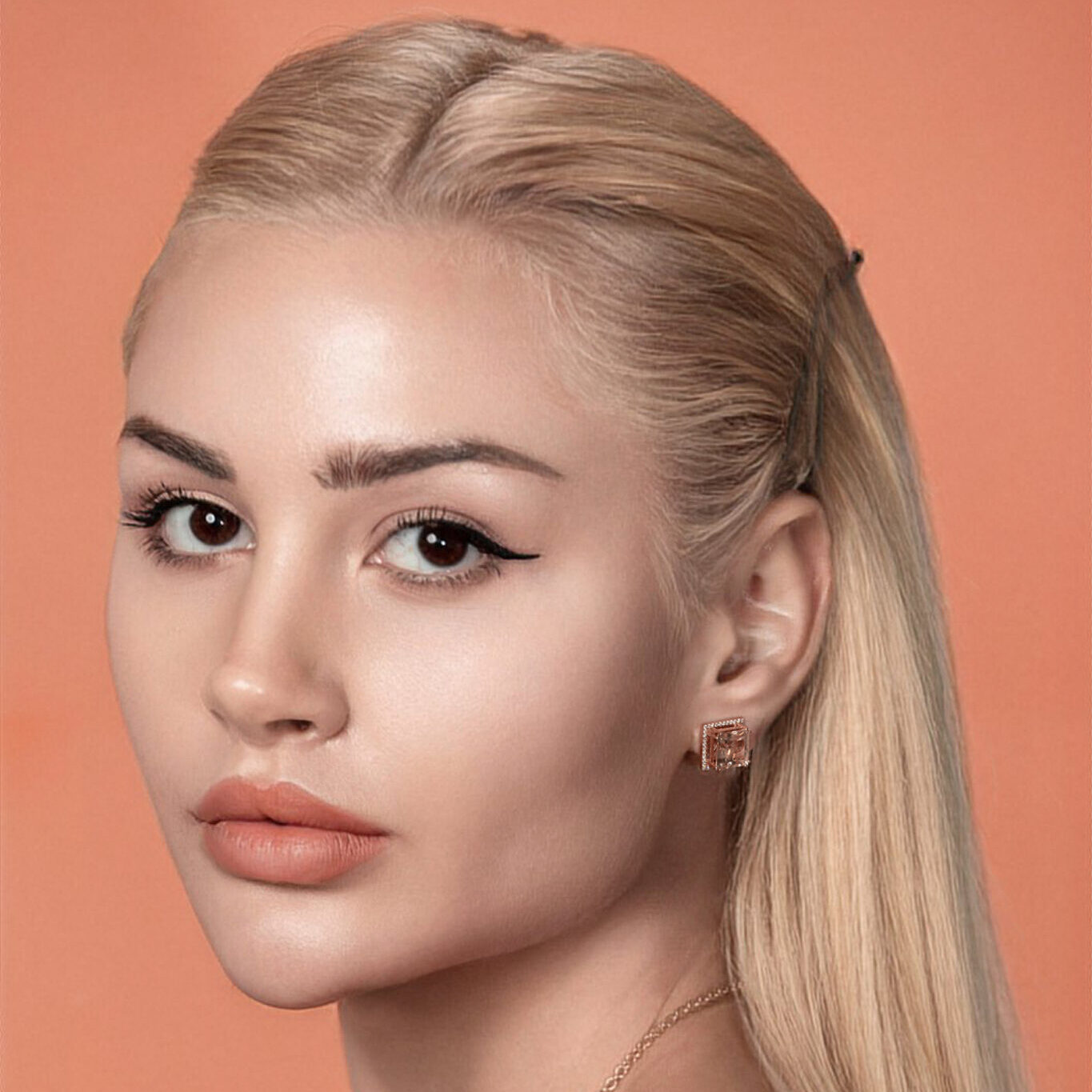 Description: Handcrafted in 18k Rose Gold, Centered with 2 Morganites 6.8ct., and Accented by 80 Brilliant Cut Diamonds 0.21ct. F-Vs. Item weight: 7.7g. Gold weight: 6.3g. Dimensions: L: 16.4 x W: 16.4 x H: 6.9mm.