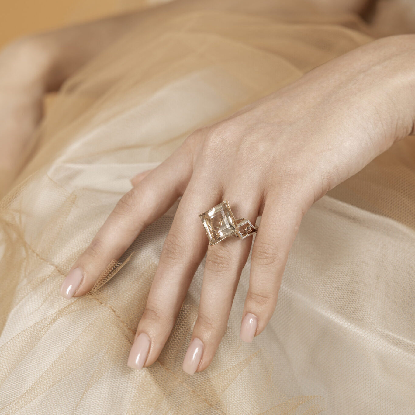 Handcrafted in 18k Rose Gold, Centered with Morganite 14.9ct., and Accented by 2 Spinel 0.30ct., 74 Brilliant Cut Diamonds 0.28ct. F-Vs.