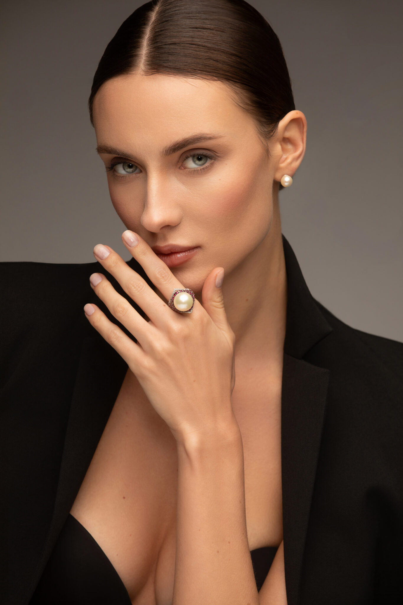 Handcrafted in 18k White Gold, Centered with Pearl 15mm., and Accented by Brilliant Cut Diamonds G, H-VS 0.25ct, Rubies 1.68ct.