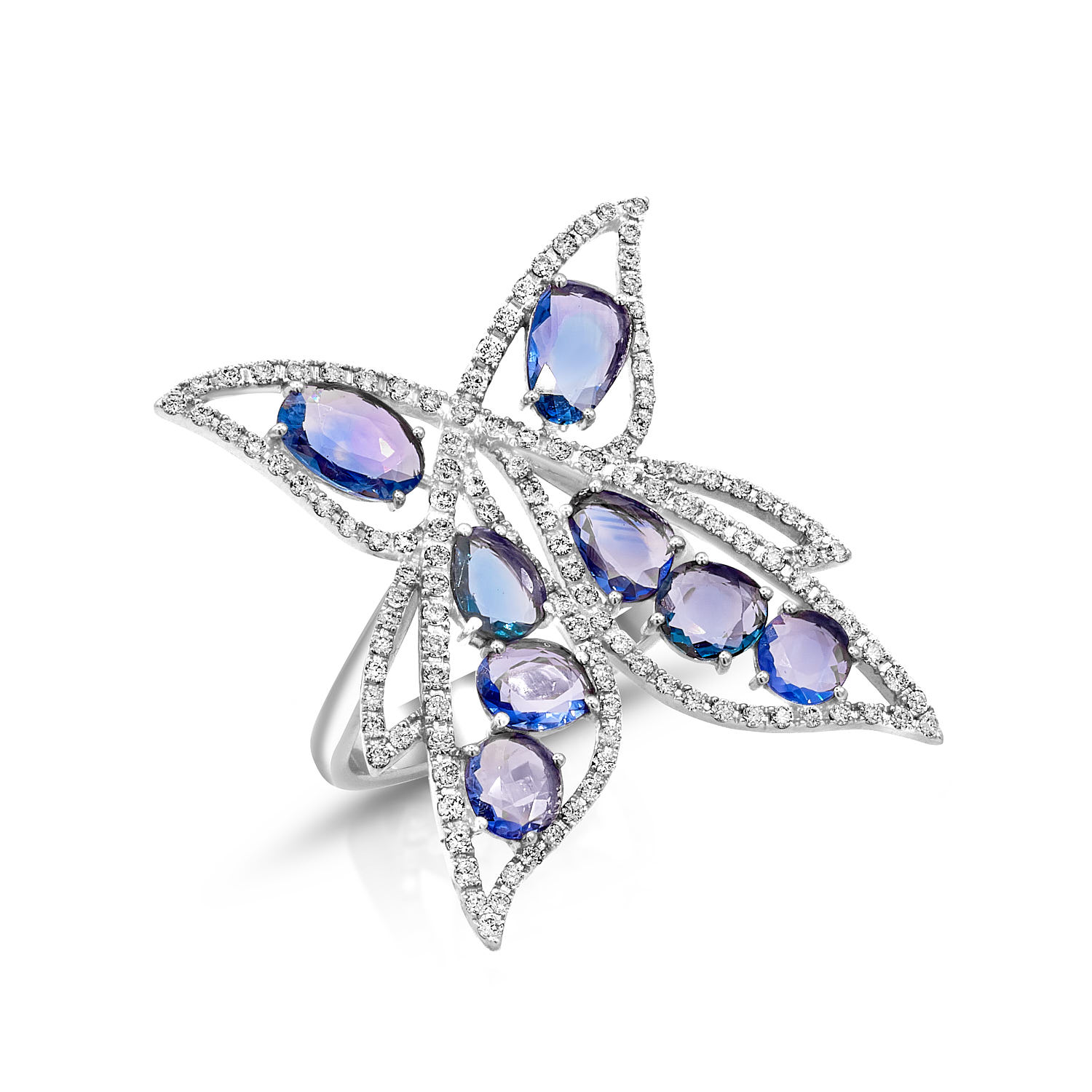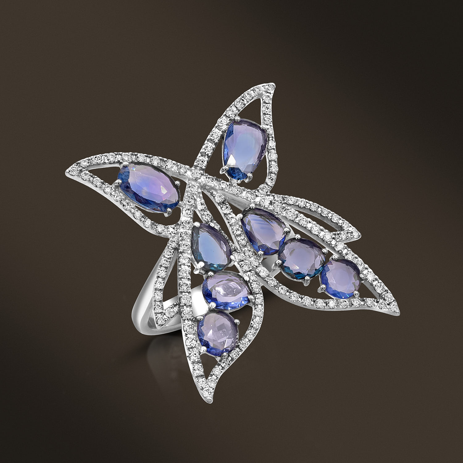 Description: Handcrafted in 18k White Gold, and Accented by 8 Rose Cut Blue Sapphires 2.98ct., 125 Brilliant Cut Diamonds 0.69ct. G-VS. Item weight: 8.8g. Gold weight: 7.97g. Size: 15.