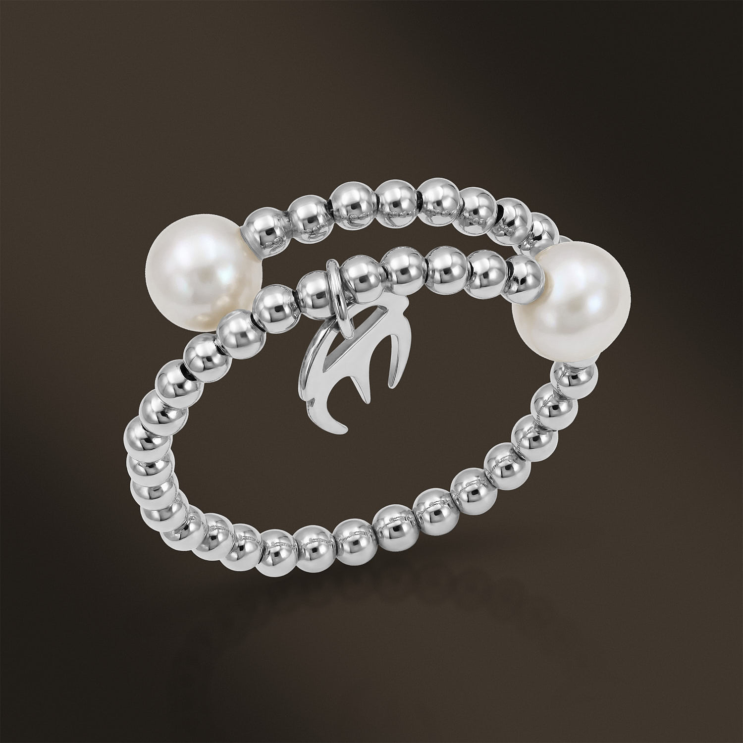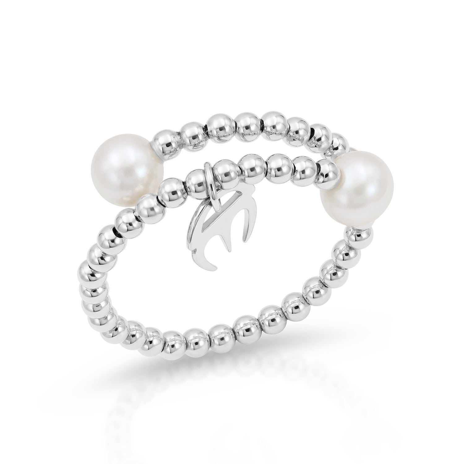 Description: Handcrafted in 18k White Gold, and Accented by 2 Pearls 4.5 – 5mm. Item weight: 1.00g. Gold weight: 0.50g. One Size.