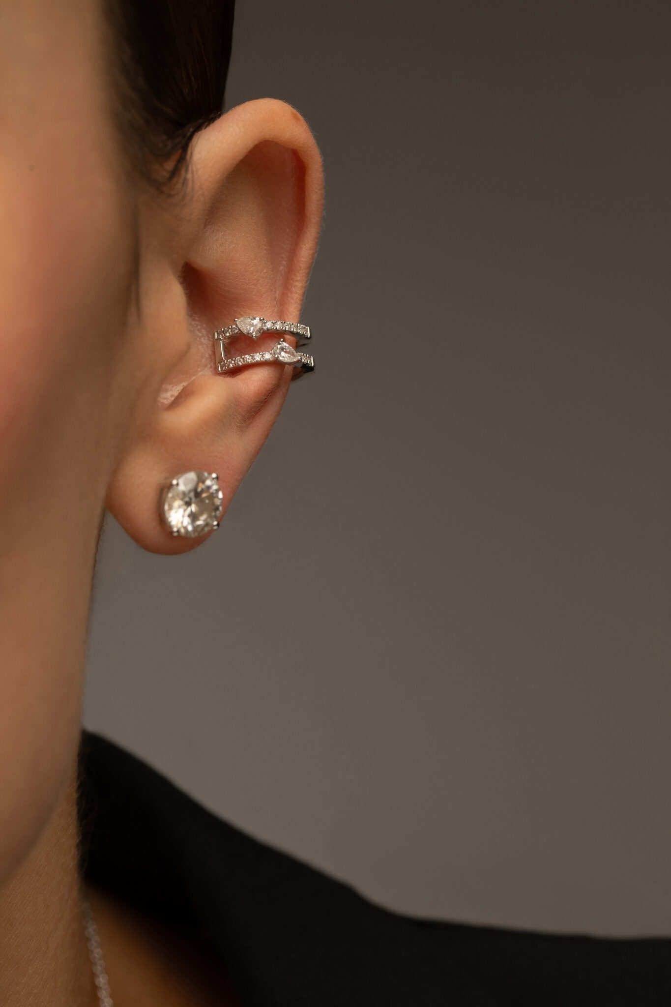 Handcrafted in 18k White Gold, Accented by 2 pcs. Pear shape and 18 pcs. Brilliant Cut Diamonds 0.28ct. G-VS.